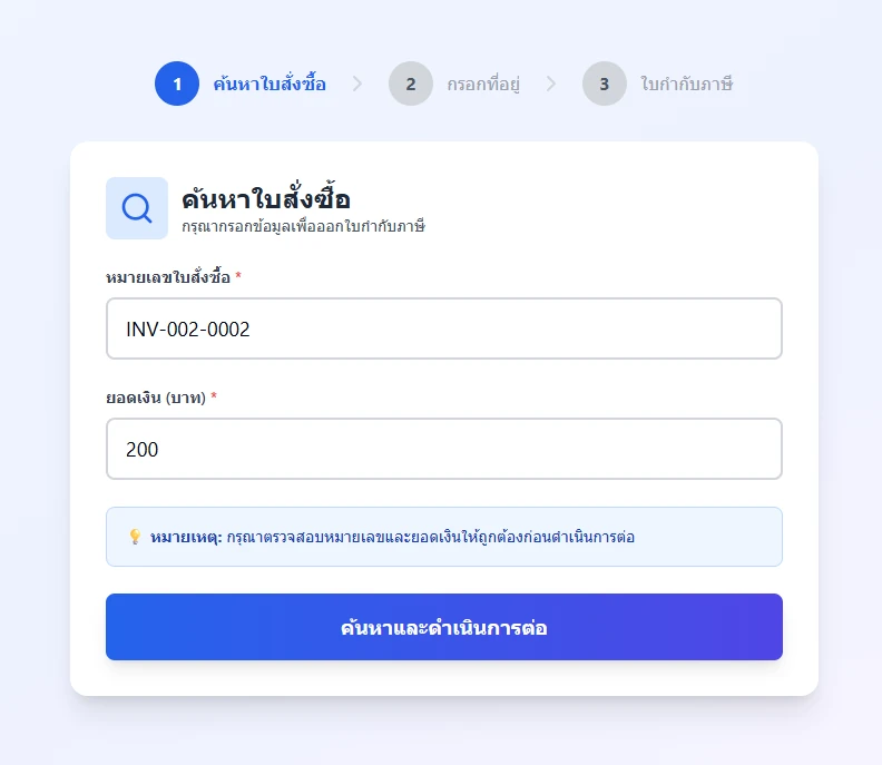 2. ลูกค้ากรอกข้อมูล ซึ่งอาจจะเป็น Invoice Number หรือ Tax Invoice ABB พร้อมจำนวนเงิน เพื่อให้ระบบตรวจสอบความมีตัวตนของเอกสาร รวมถึงสถานะการออกใบเสร็จว่าออกไปหรือยัง
