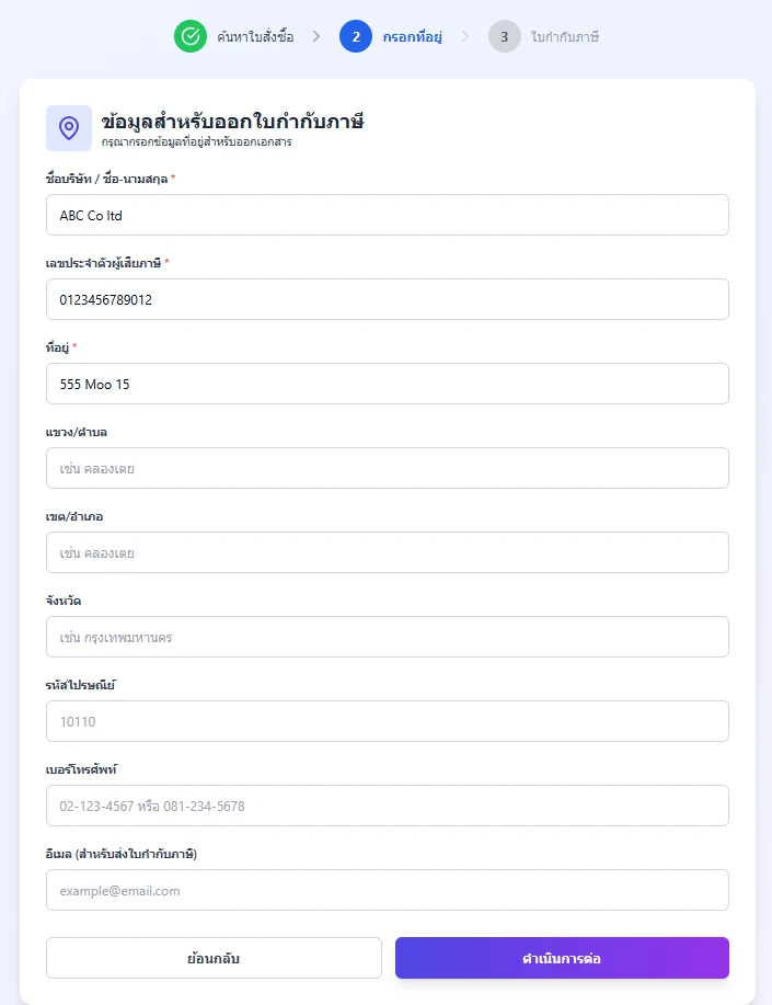 3. ลูกค้ากรอกข้อมูล ลูกค้ากรอกข้อมูลที่ต้องการใช้ออกใบกำกับภาษี เช่น ชื่อ/ชื่อบริษัท เลขประจำตัวผู้เสียภาษี ที่อยู่สาขา