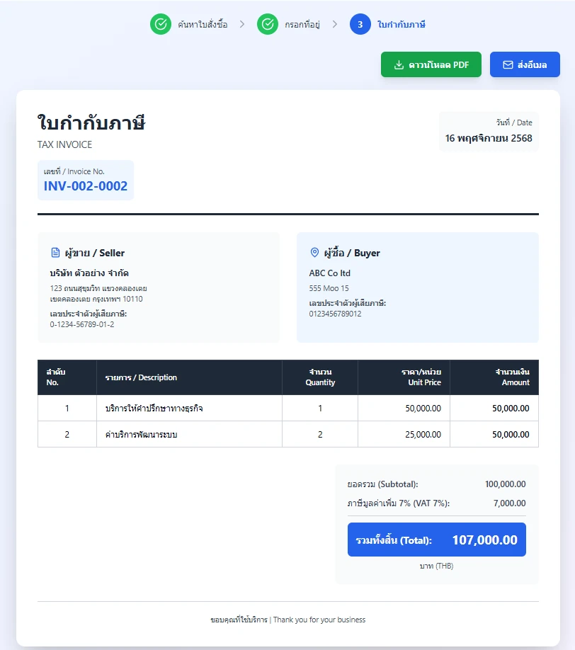 4. ระบบทำการออกใบกำกับภาษีเต็มรูปให้และ อนุญาตให้ดาวน์โหลด หรือ ส่งทางอีเมล์